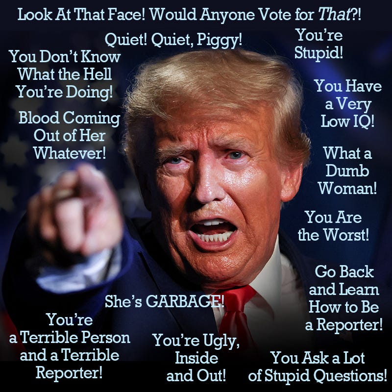 Despite the impenetrable quality of his status, or perhaps because of it, Trump never seems to walk away from an opportunity to insult someone, especially if that someone is a woman, particularly around her intelligence, mental health and/or looks. He has insulted women throughout his public life, which is many decades now, calling some of us “low-IQ, weak and foolish” [Kamala Harris] (oh, he also called her the R-word before his most recent incident), “dumb” [Sunny Hostin], “filthy, dirty, disgusting, loser” [Whoopi Goldberg], “crazy” [Nancy Pelosi], “horseface, con,” [Stormy Daniels], “extremely unattractive,” [Bette Midler], having a “fat, ugly face,” [Rosie O’Donnell], “crazed, crying lowlife,” [Omarosa Manigault Newman], “nasty woman,” [Hillary Clinton], a “bimbo,” [Megyn Kelly], a “loser,” [April Ryan] and much more. So this is not to say that this behavior is new to him, not by any yardstick, but I will say it seems to be ramping up as he is more and more defensive.